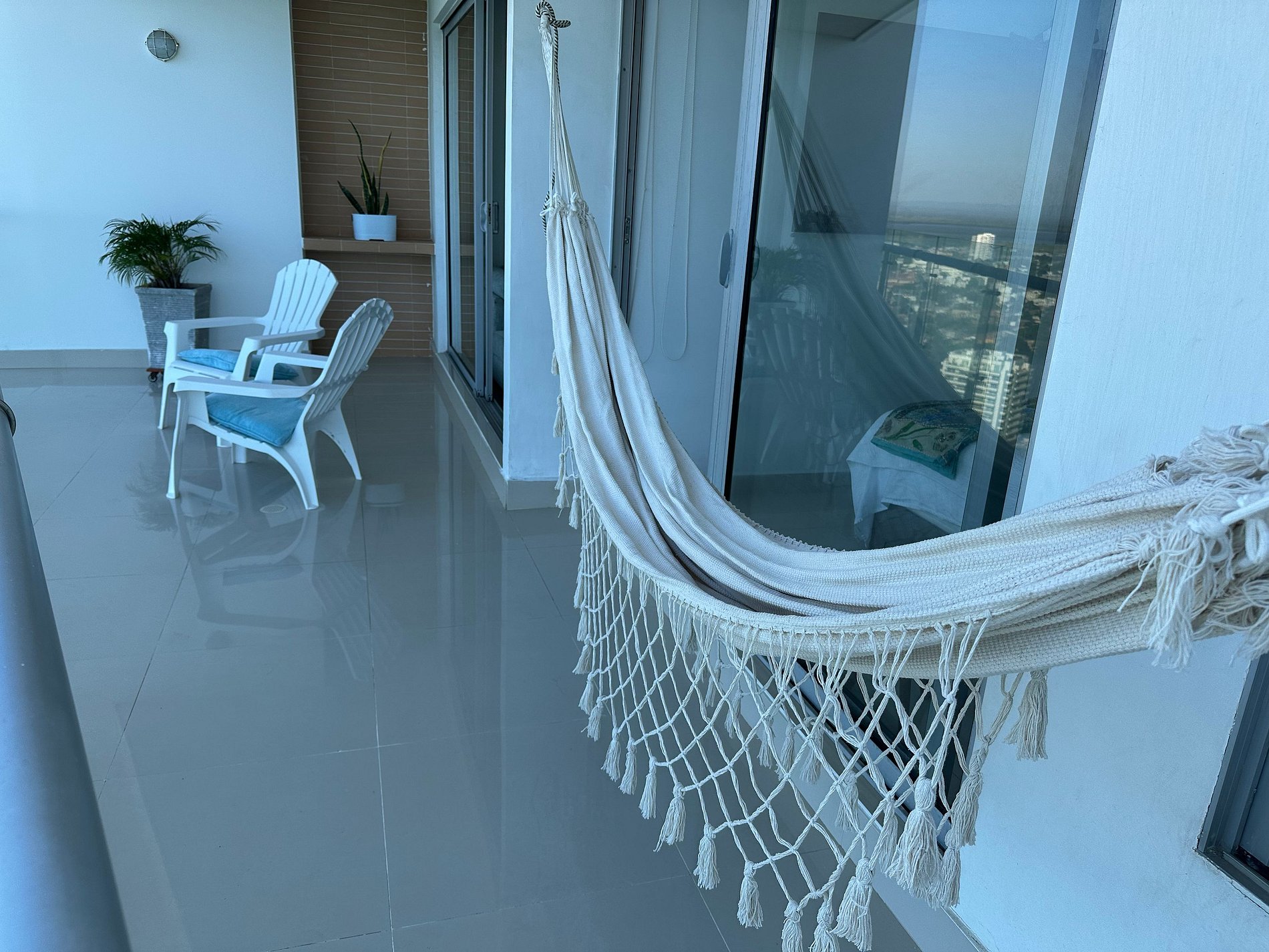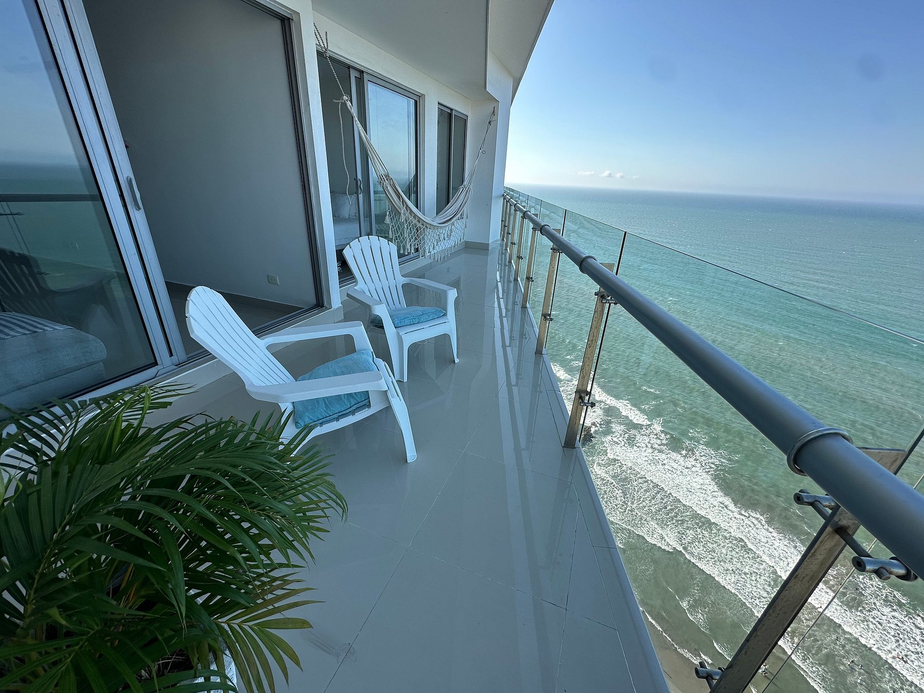 El balcón tiene una hermosa vista a la playa, con dos mecedoras y hamaca.
