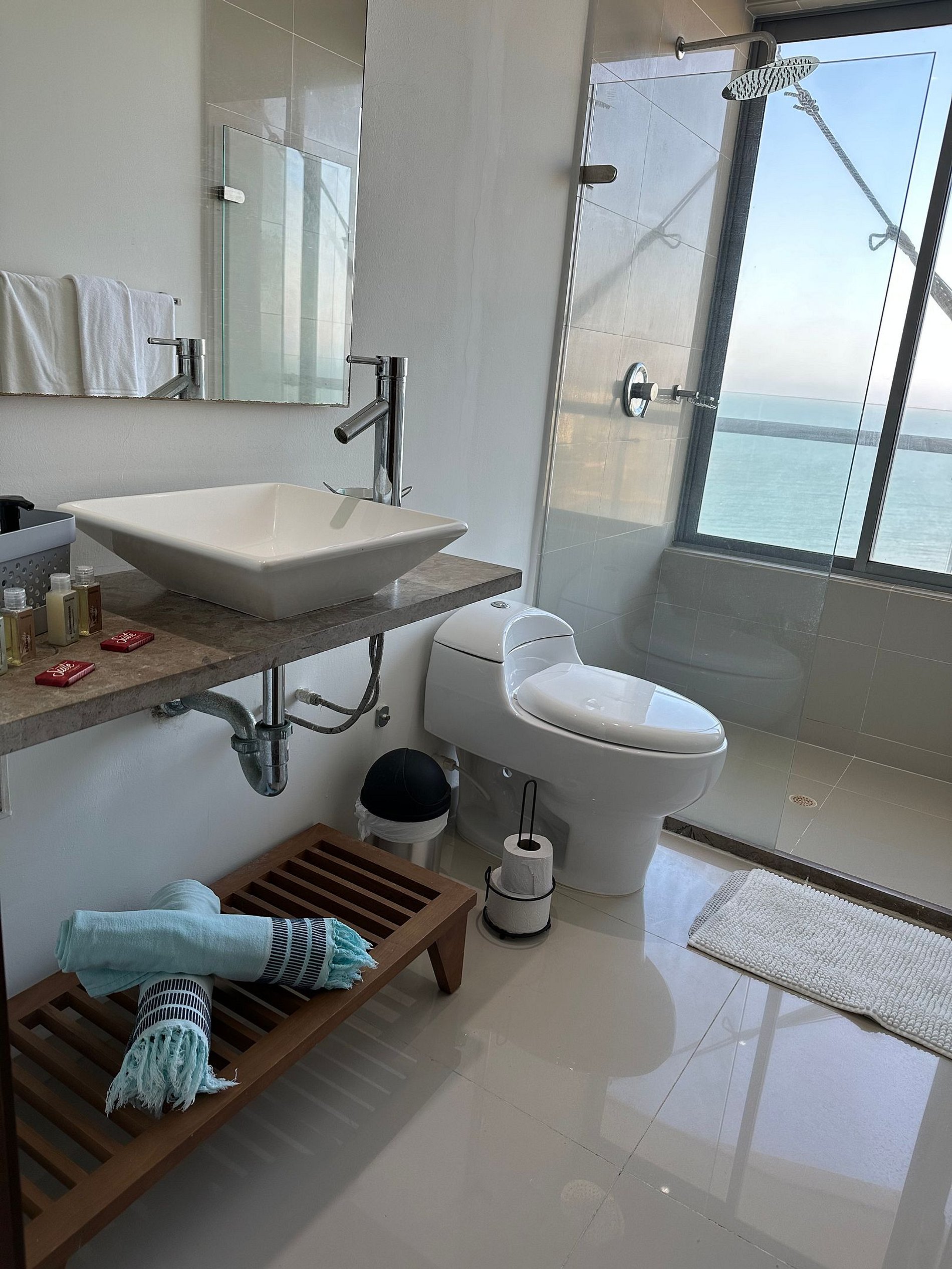 El apartamento tiene una espectacular vista al mar desde la sala, el balcón, el cuarto y el baño principal y se encuentra en un edificio moderno con piscina de adultos y de niños, sauna, turco, jacuzzis, parque de juegos infantiles, zona de asoleadoras, gimnasio y seguridad las 24 hs