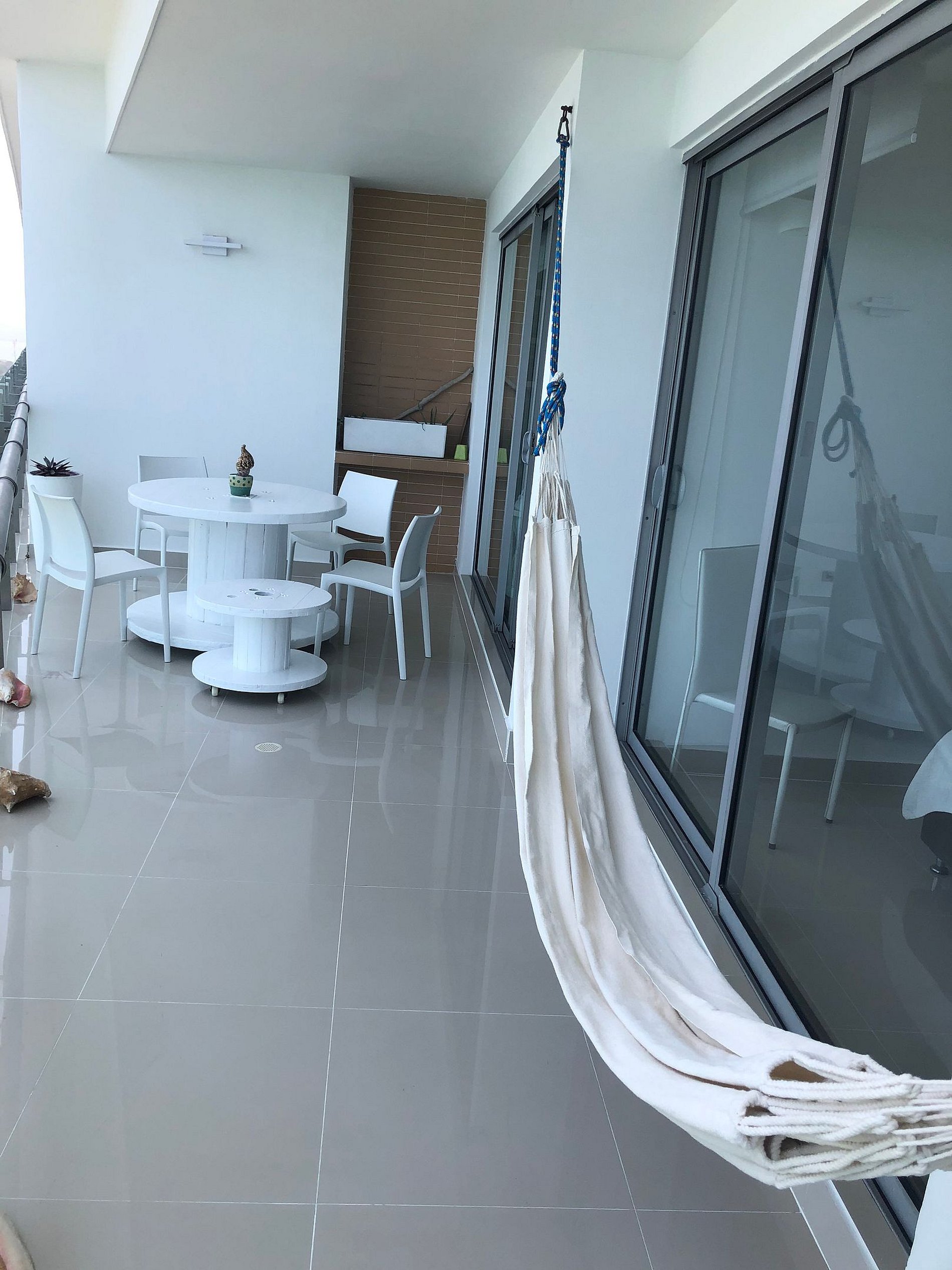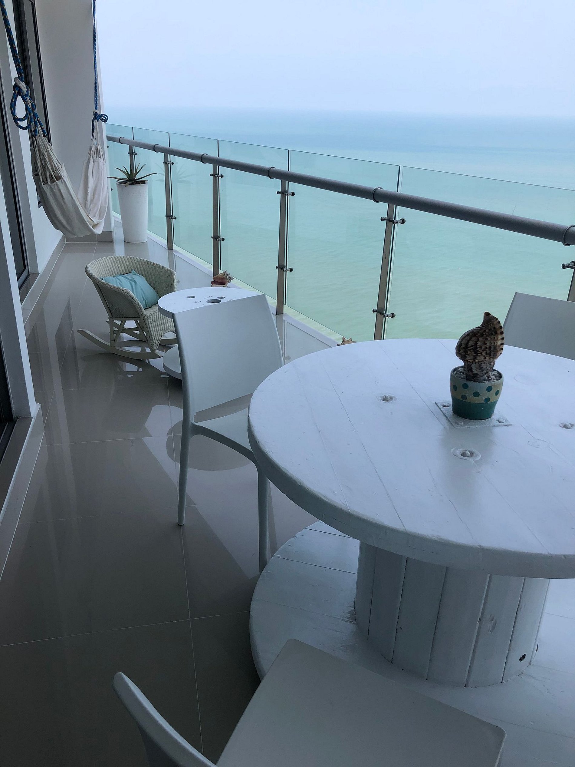 El balcón tiene una hermosa vista a la playa, con una sala exterior, un comedor de 4 puestos y hamaca.