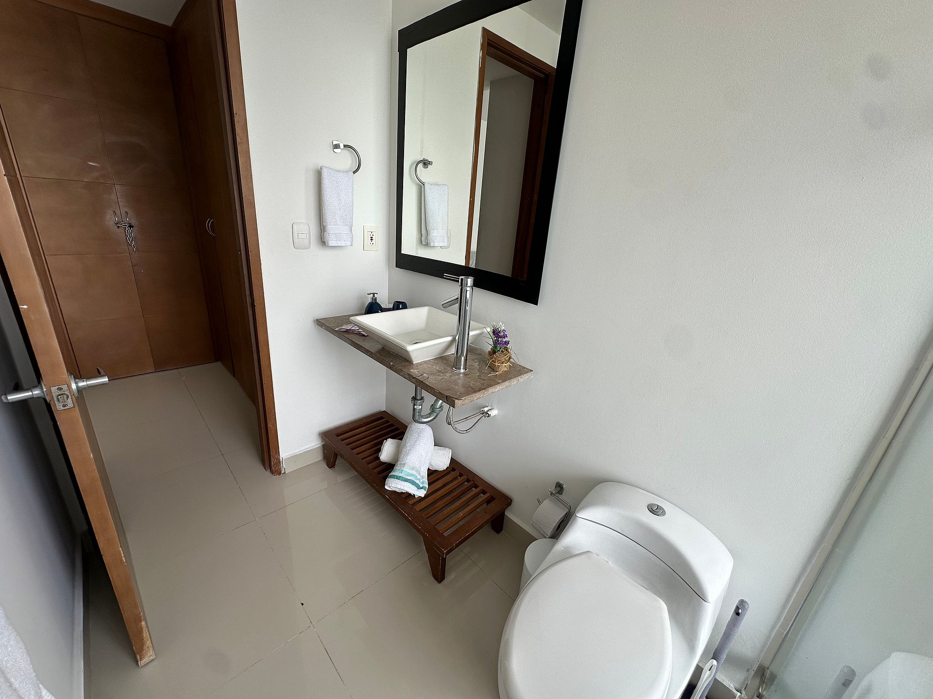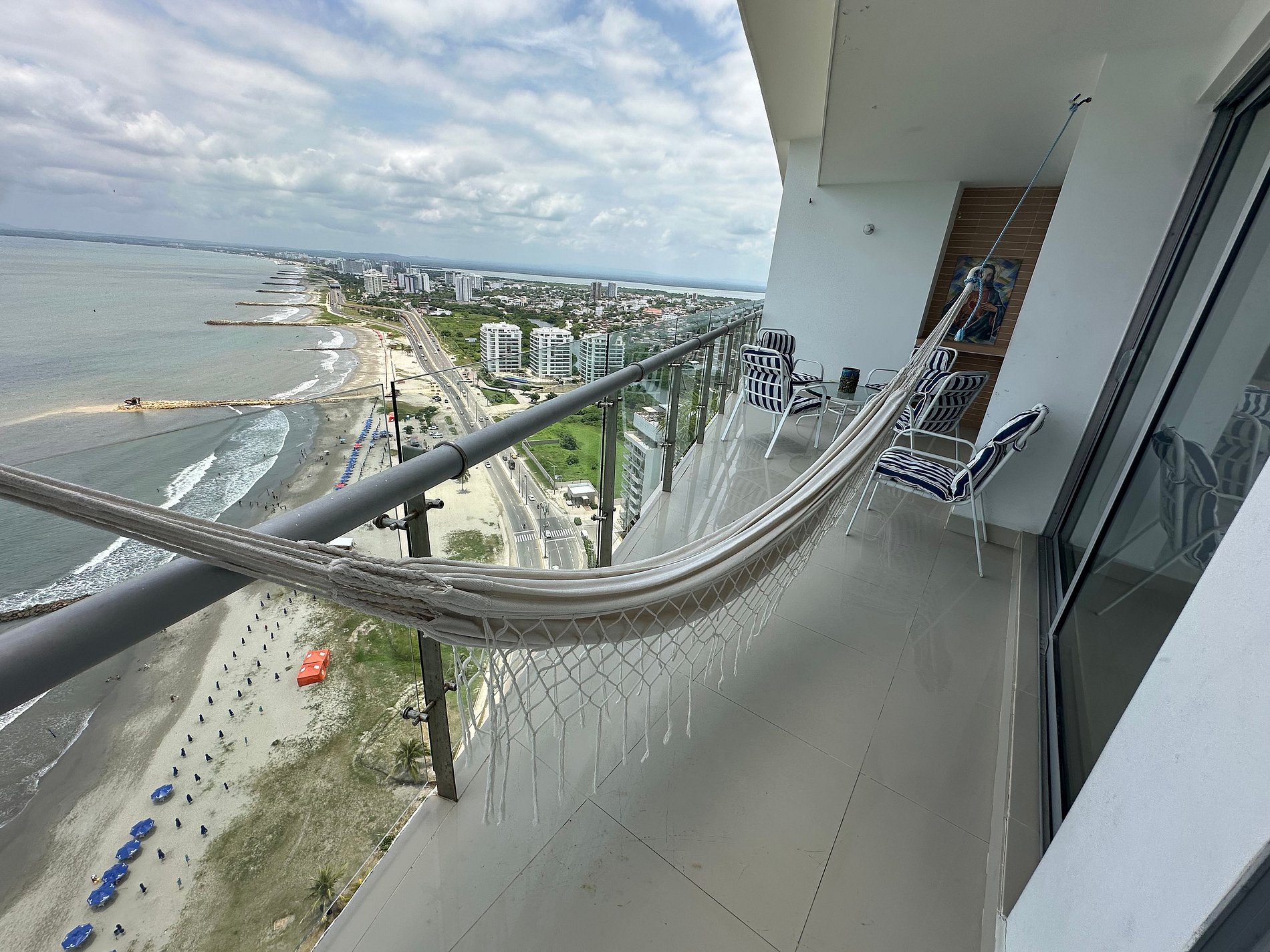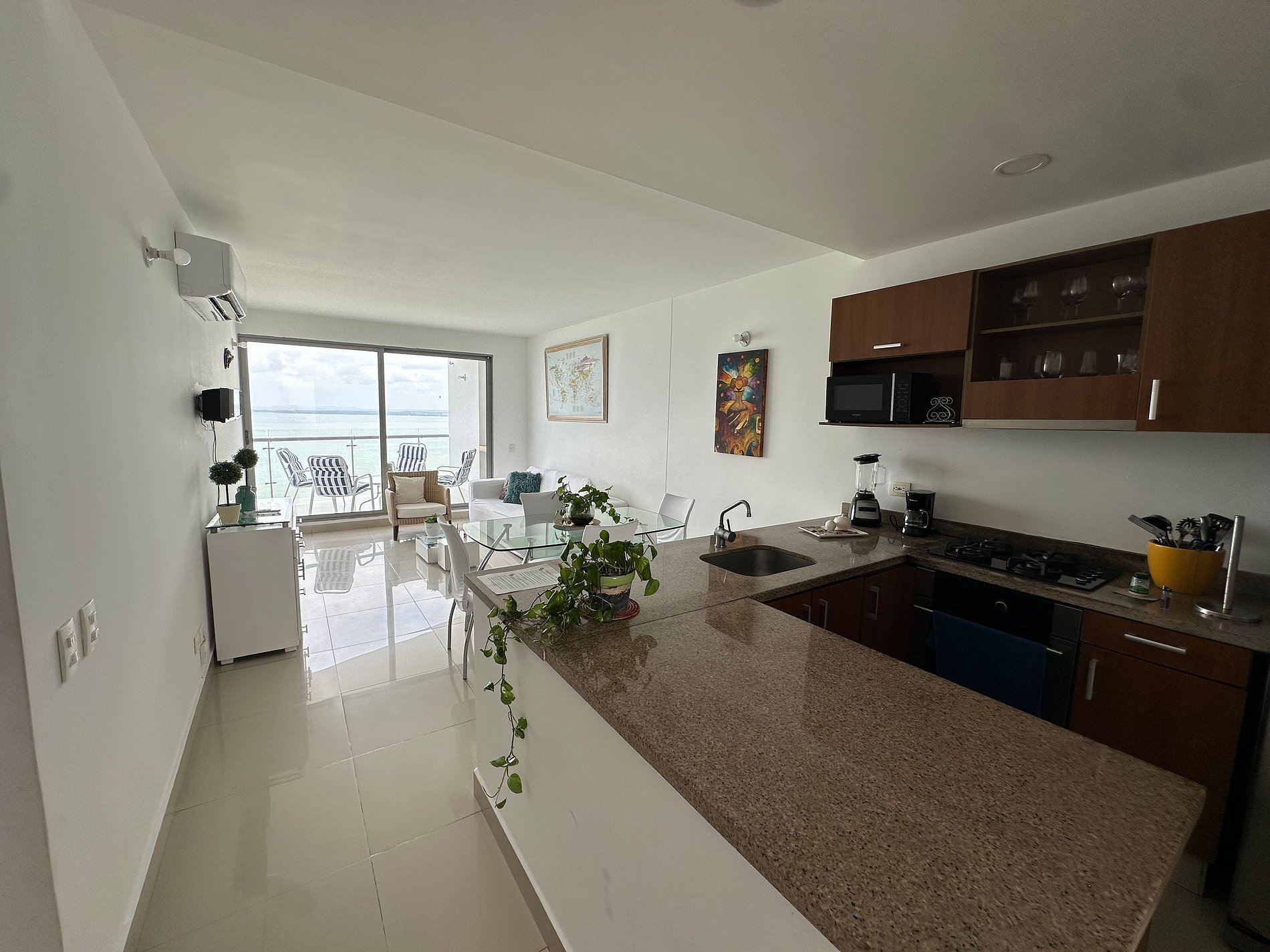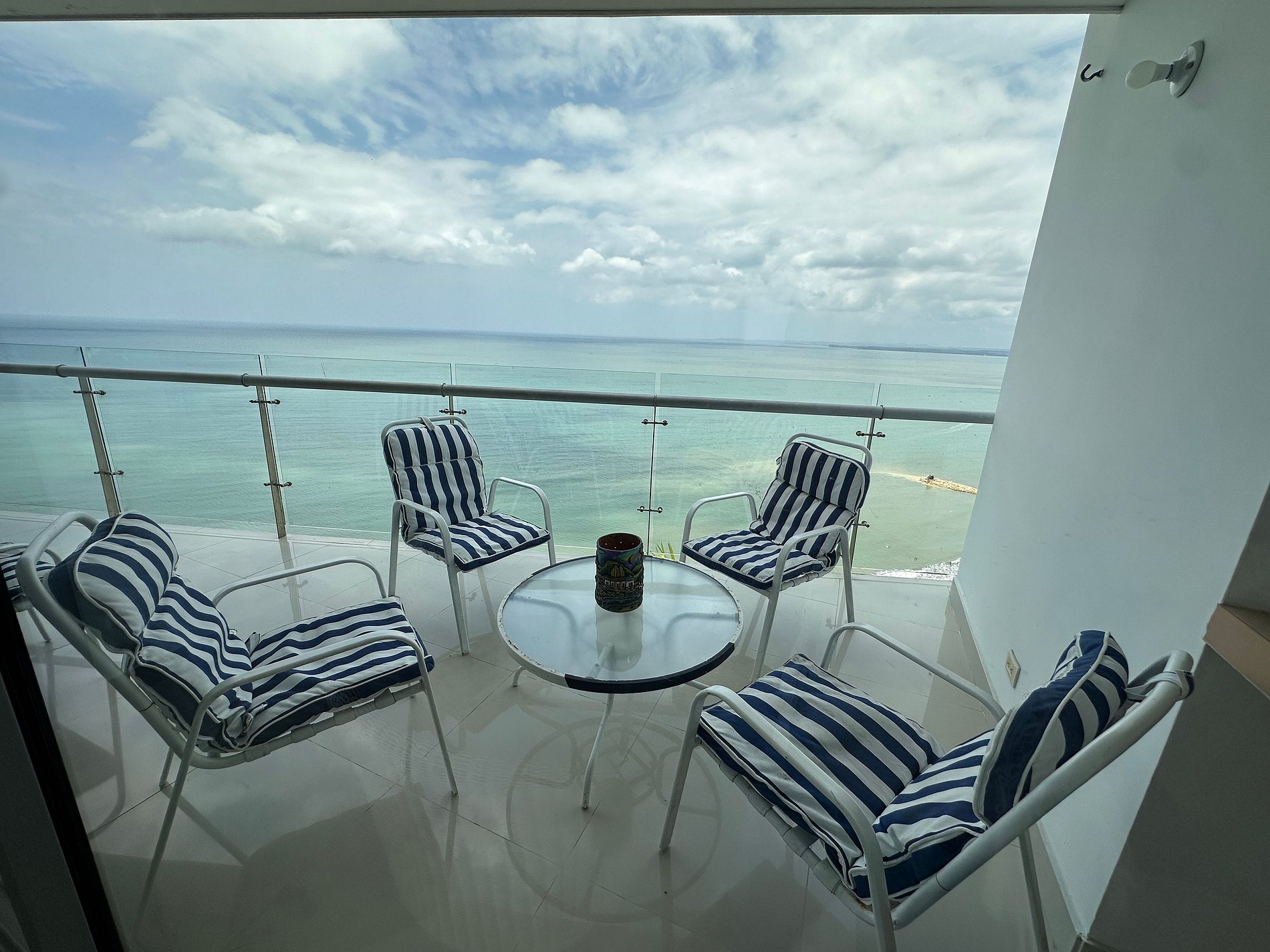 El apartamento tiene una espectacular vista al mar desde la sala, el balcón, el cuarto y el baño principal y se encuentra en un edificio moderno con piscina de adultos y de niños, sauna, turco, jacuzzis, parque de juegos infantiles, zona de asoleadoras, gimnasio y seguridad las 24 hs