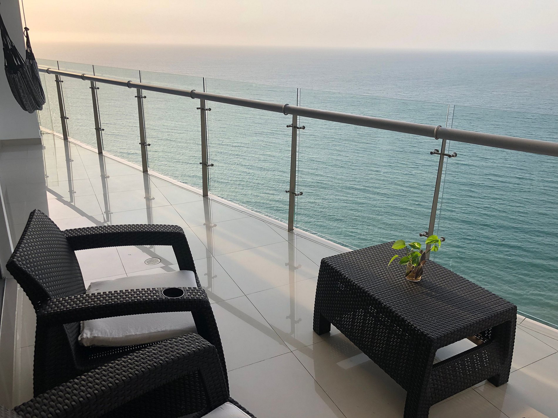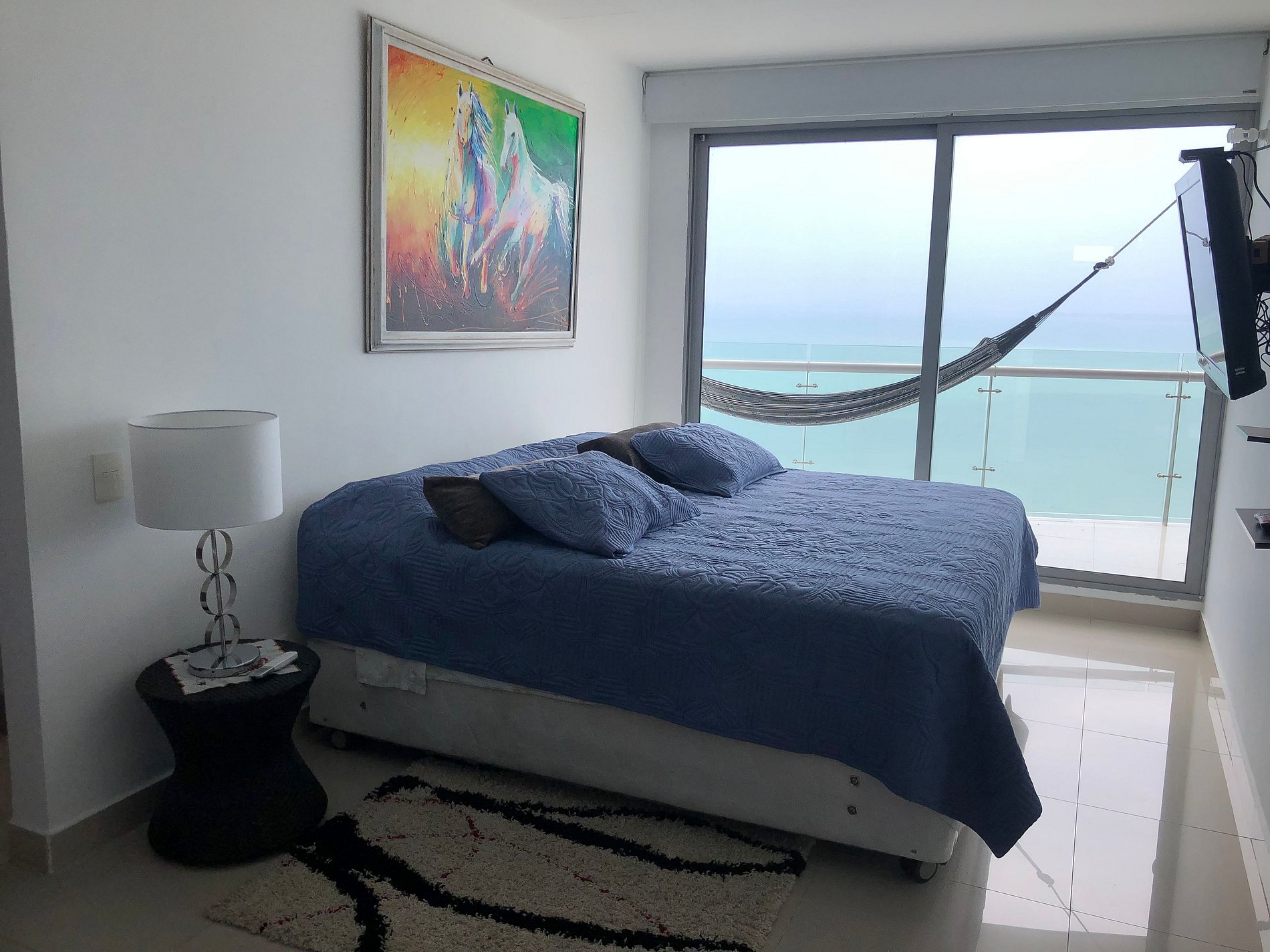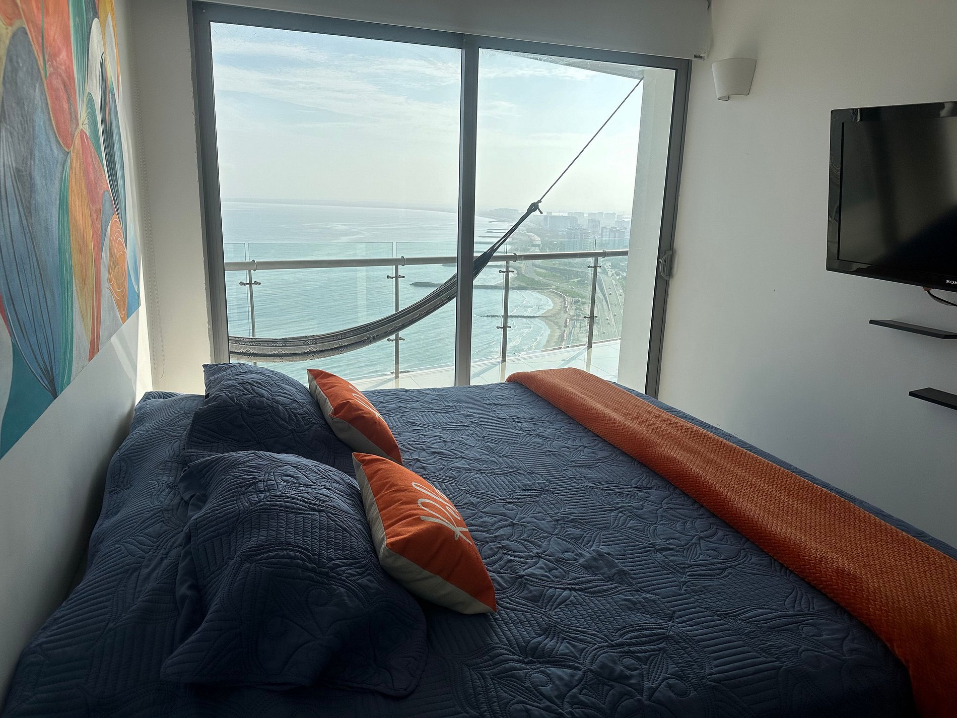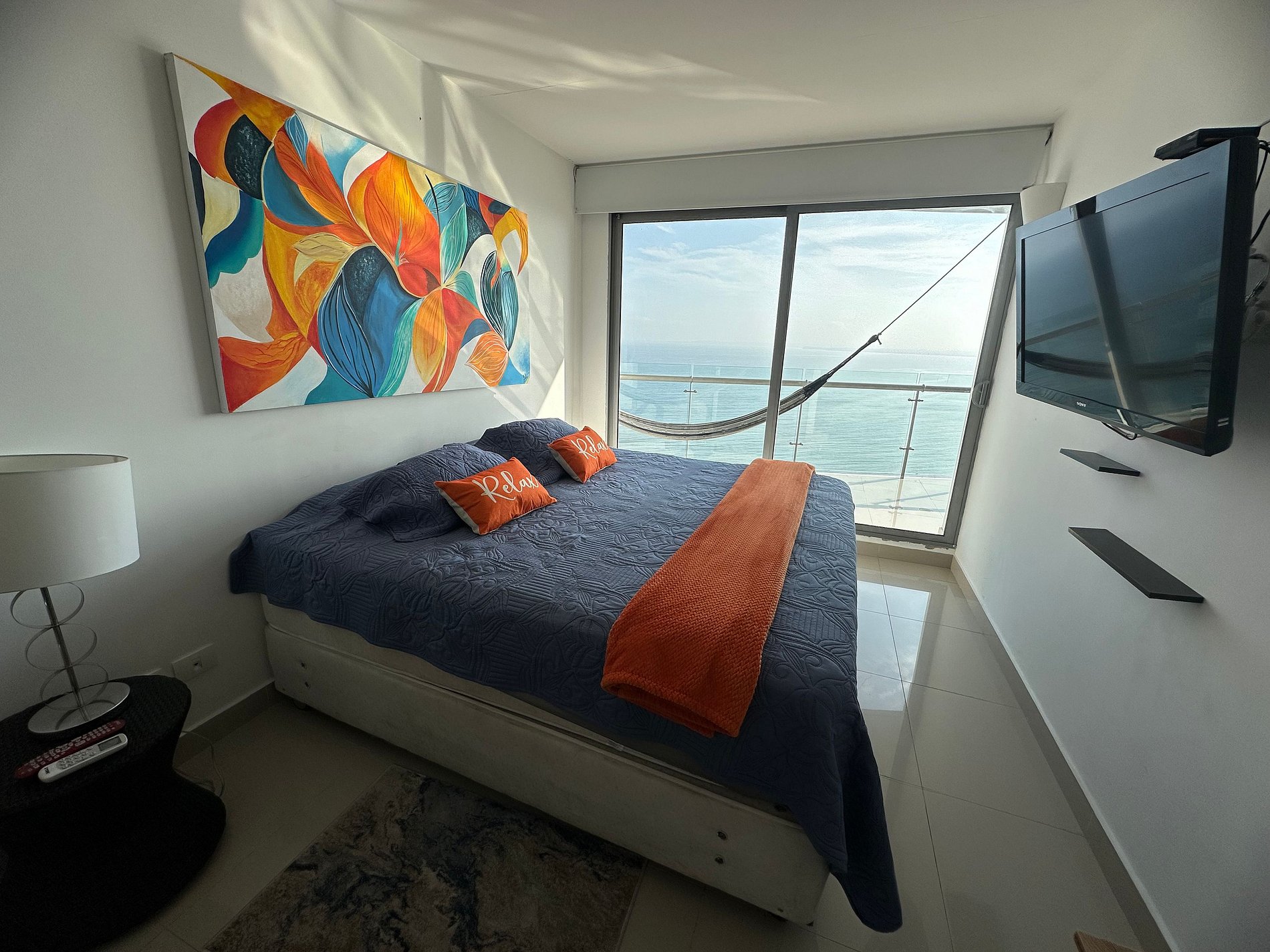 El apartamento tiene una espectacular vista al mar desde la sala, el balcón, el cuarto y el baño principal y se encuentra en un edificio moderno con piscina de adultos y de niños, sauna, turco, jacuzzis, parque de juegos infantiles, zona de asoleadoras, gimnasio y seguridad las 24 hs