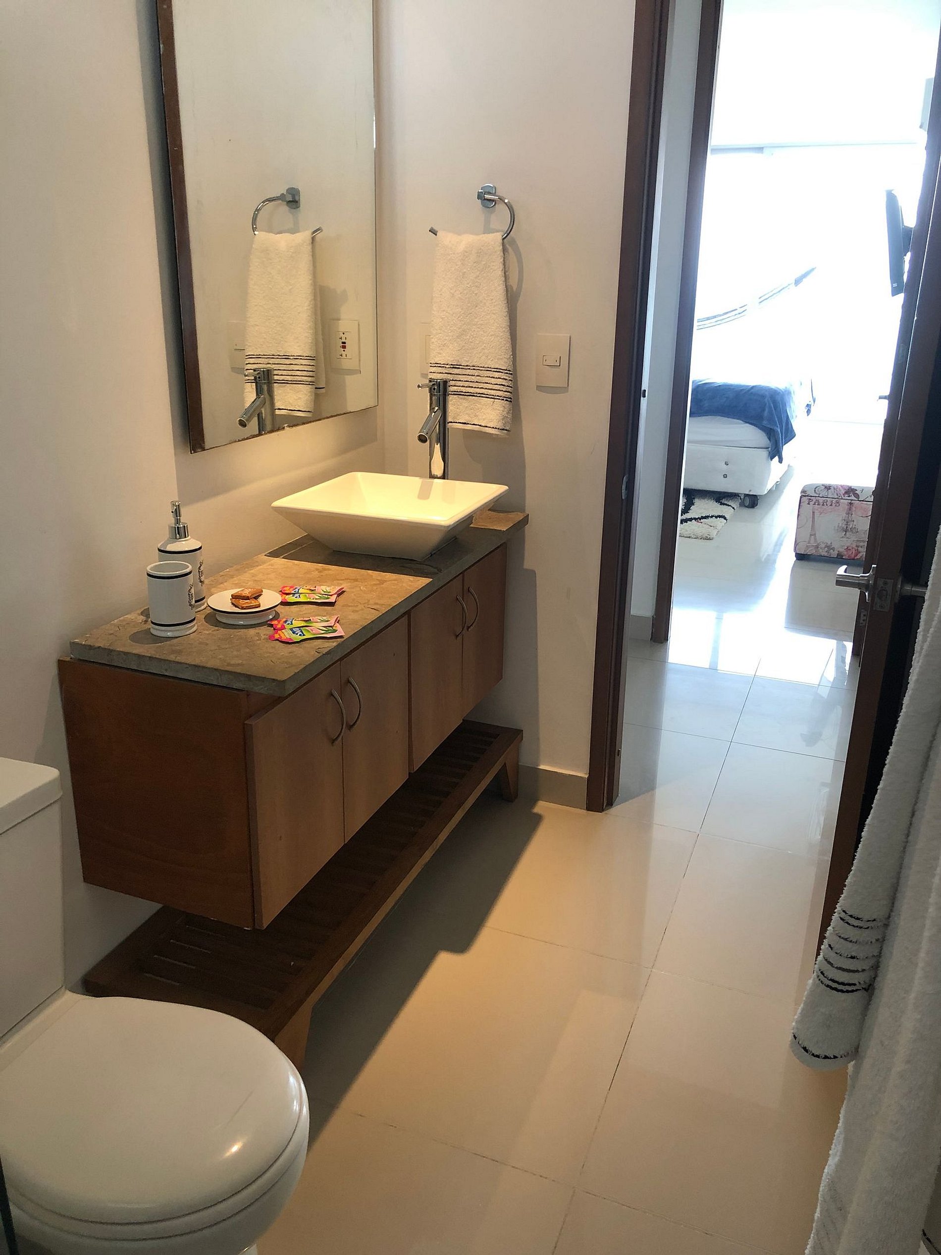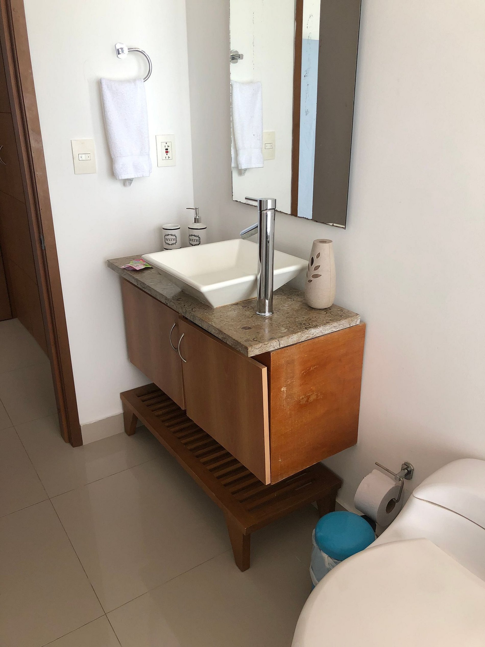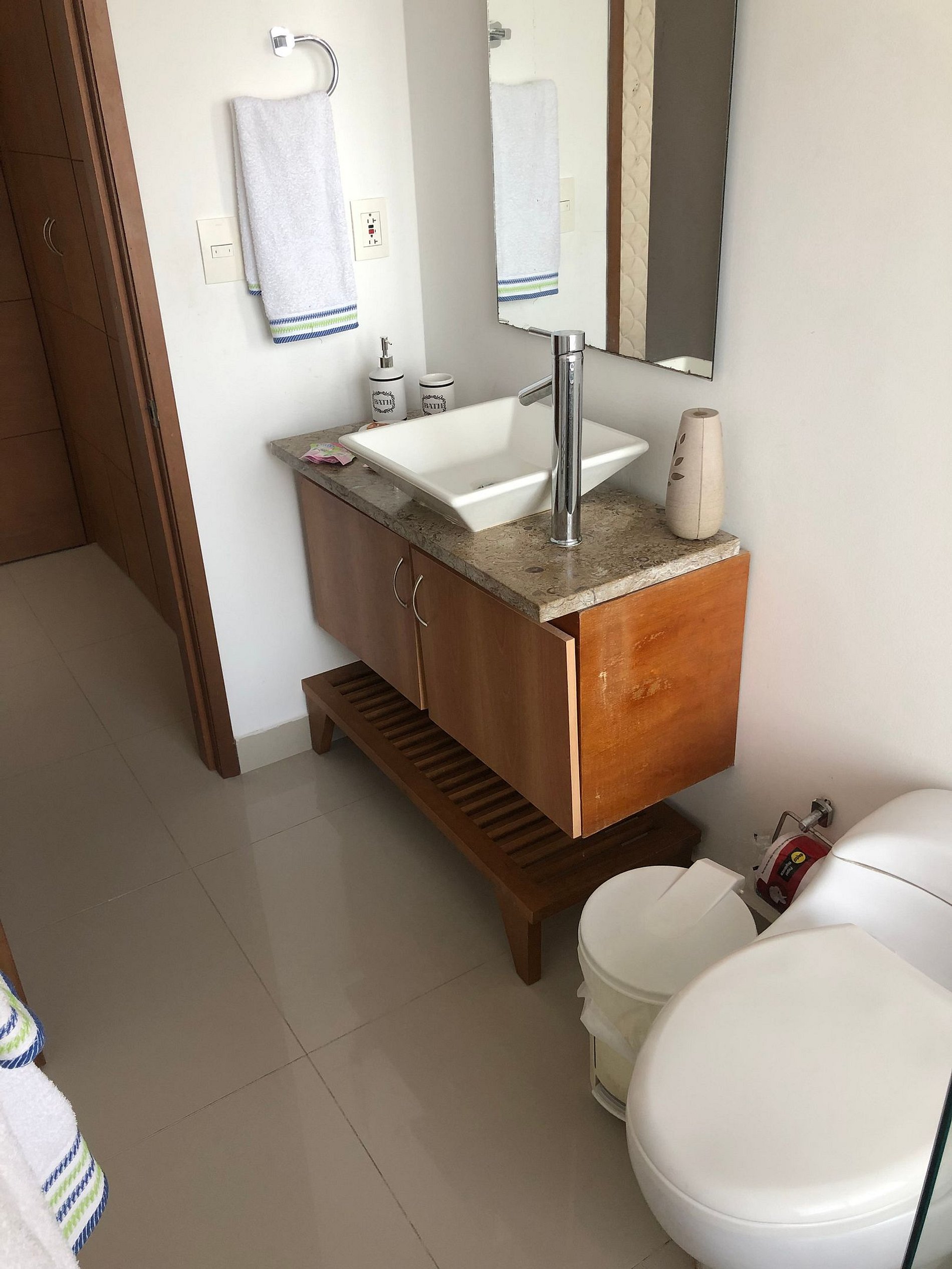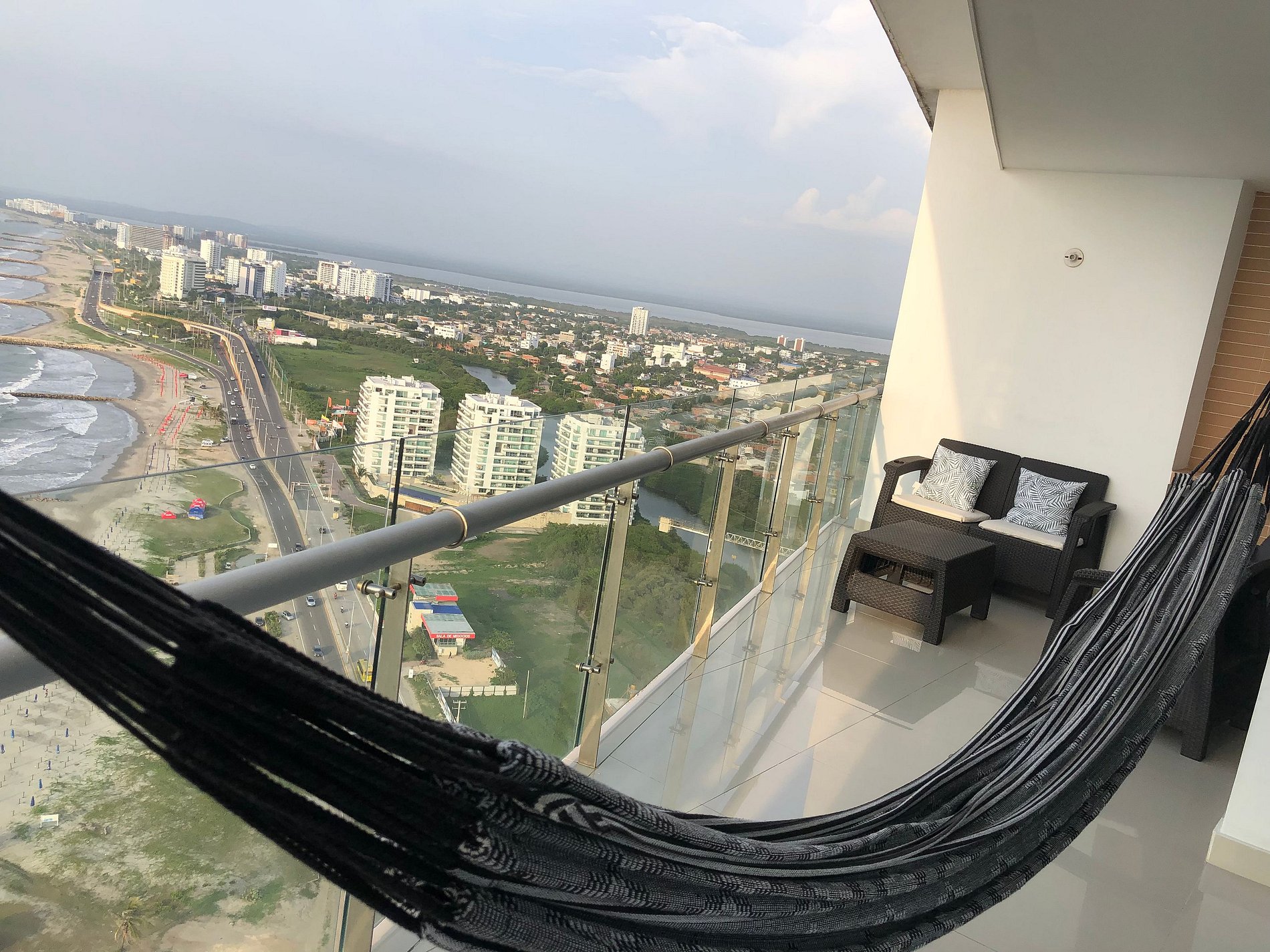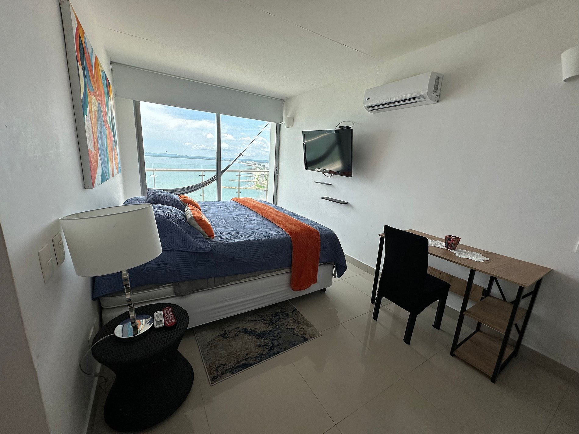 El apartamento tiene una espectacular vista al mar desde la sala, el balcón, el cuarto y el baño principal y se encuentra en un edificio moderno con piscina de adultos y de niños, sauna, turco, jacuzzis, parque de juegos infantiles, zona de asoleadoras, gimnasio y seguridad las 24 hs