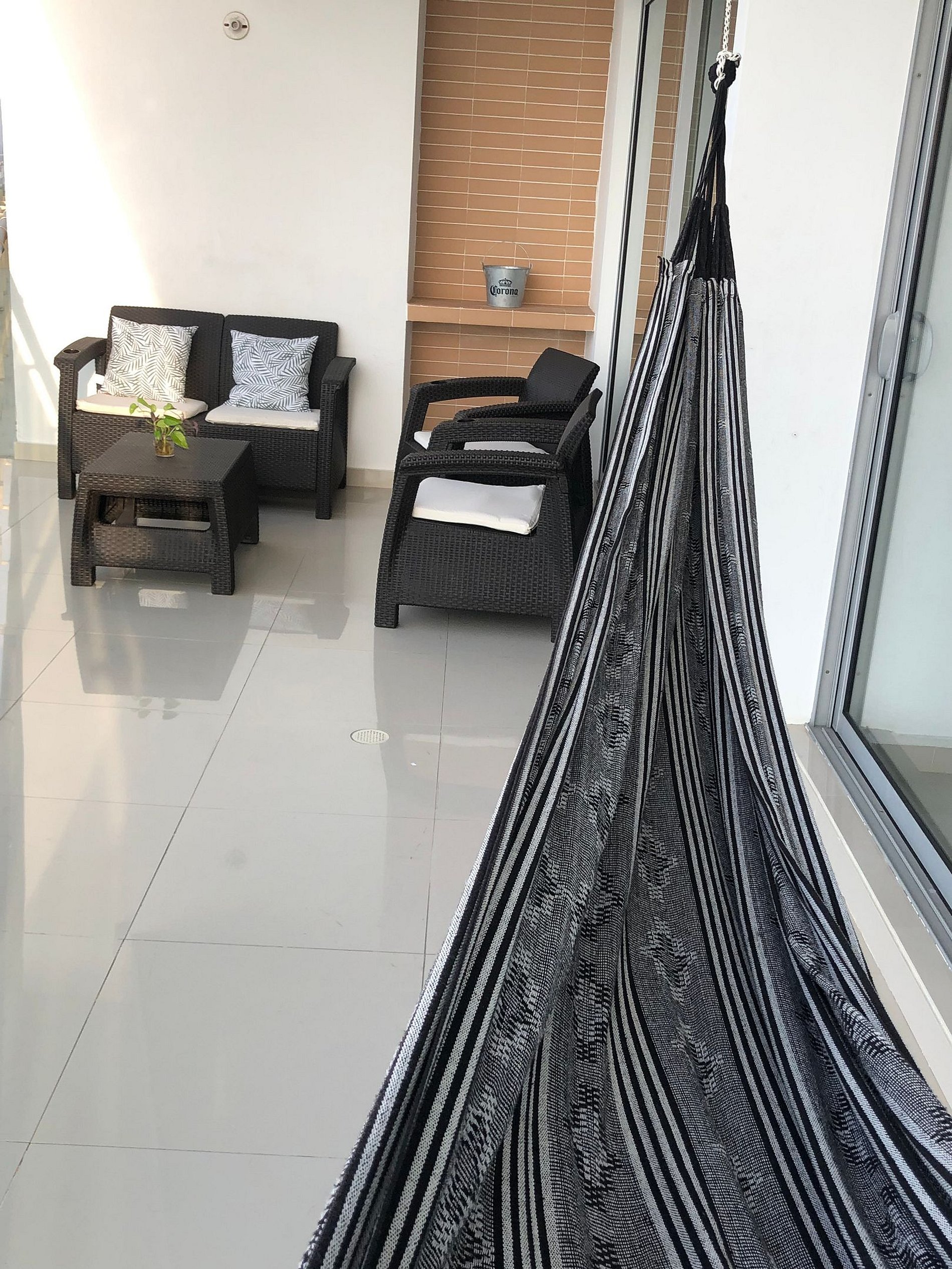 El balcón tiene una hermosa vista a la playa, con una sala exterior y hamaca.