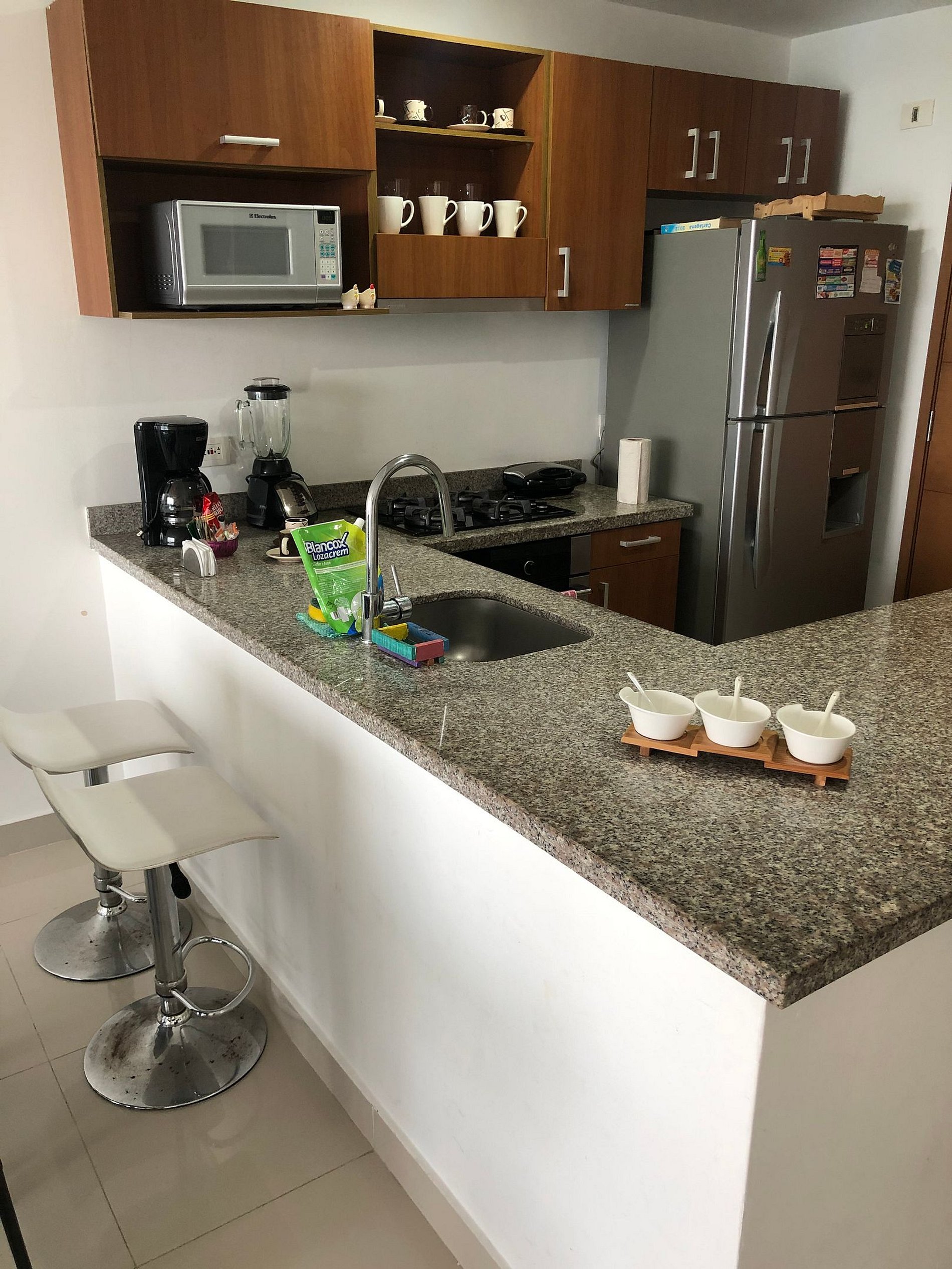 La cocina se entrega con utensilios de cocina, cafetera, licuadora, microondas, etc.