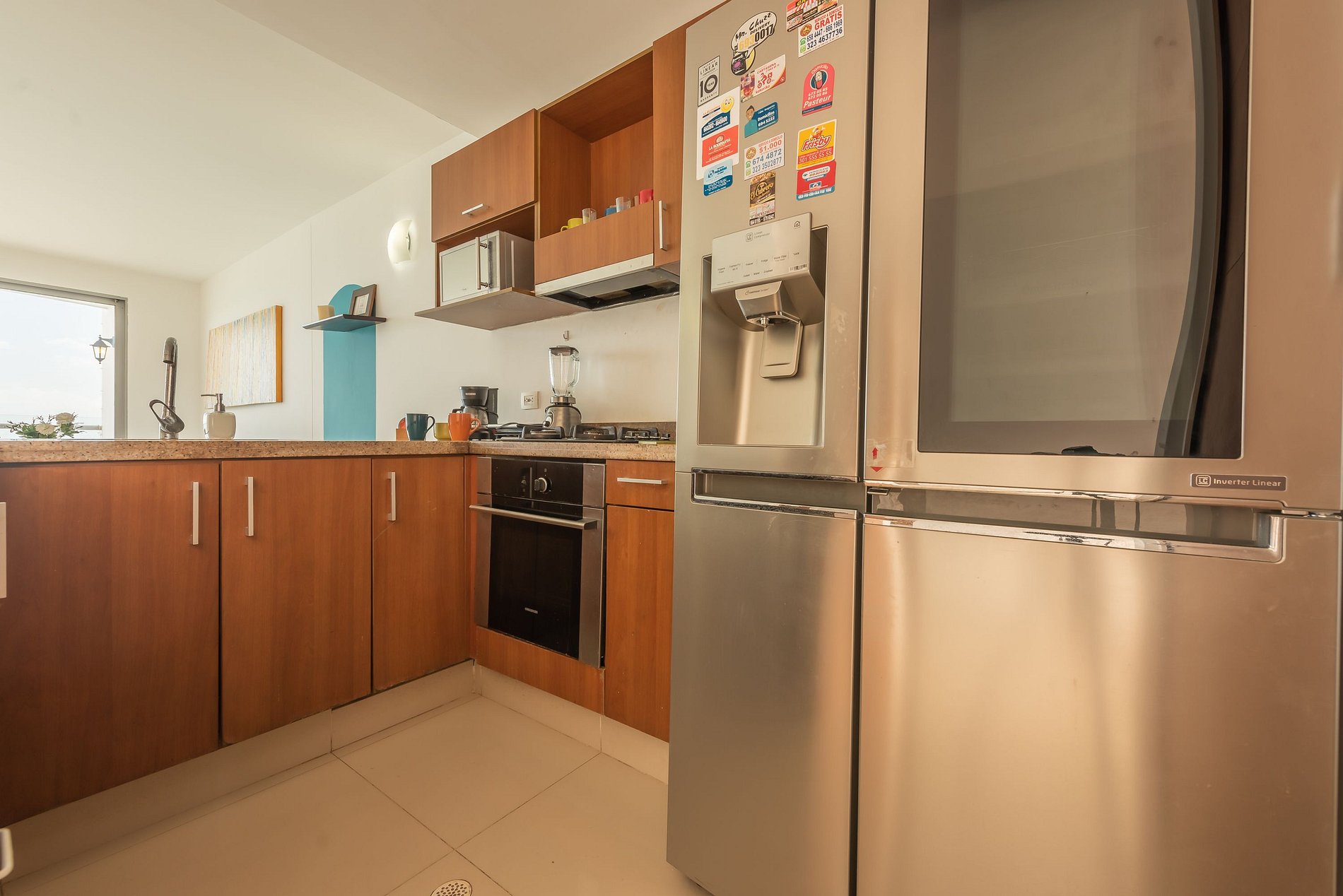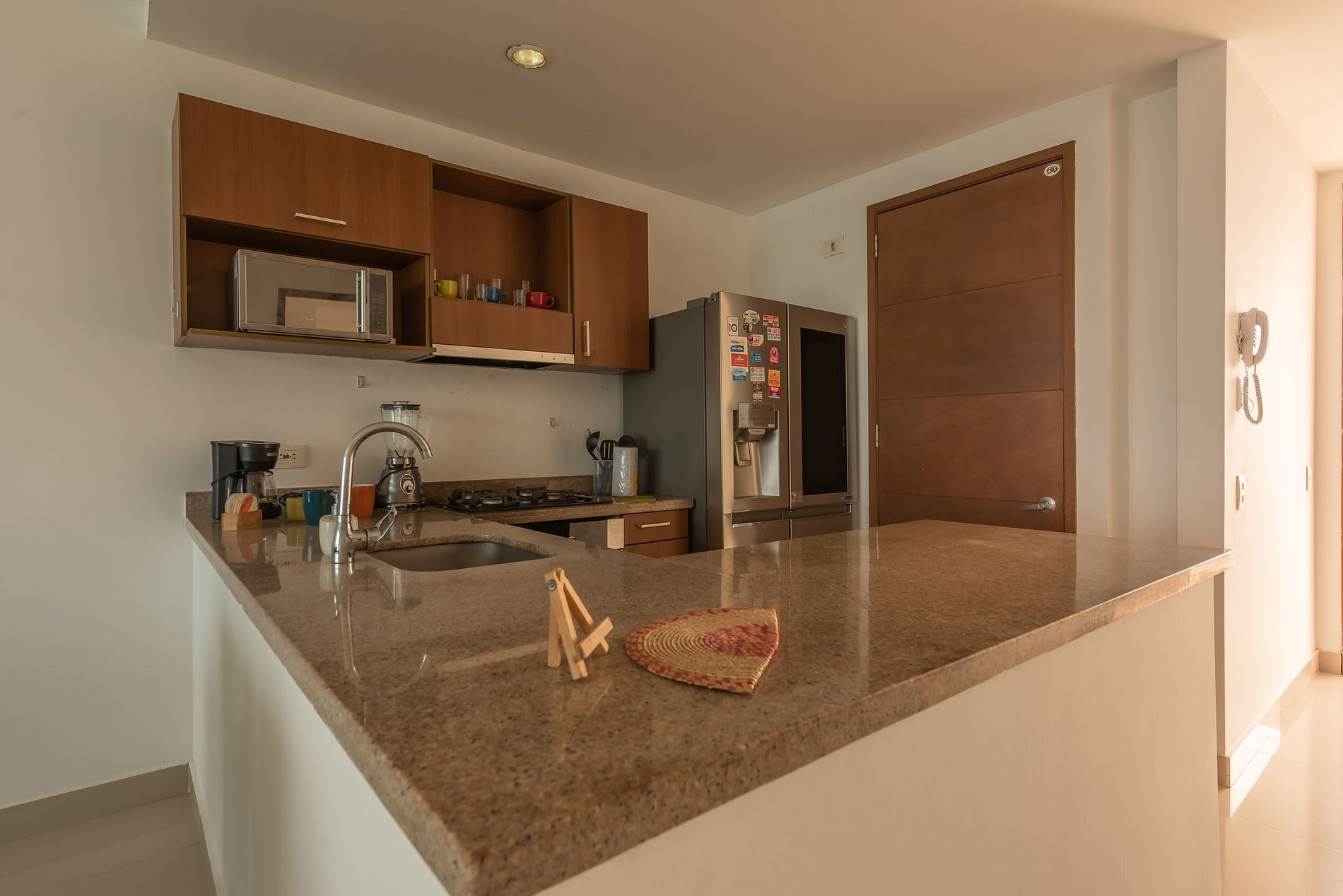 La cocina se entrega con utensilios de cocina, cafetera, licuadora, microondas, etc.
