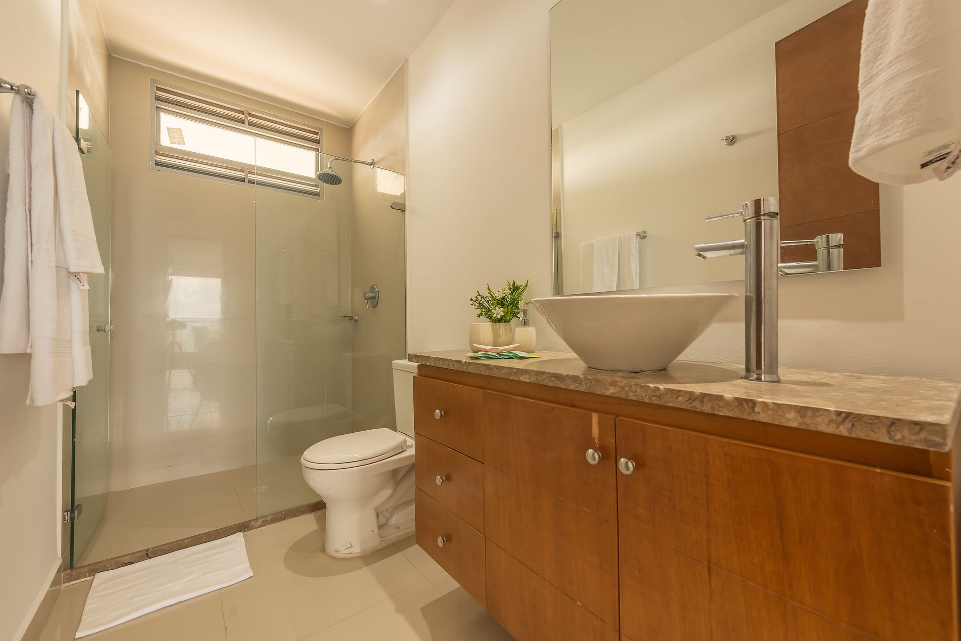 Costa de dos alcobas. La alcoba principal tiene vista directa al mar, y tiene cama doble y una cama sencilla, aire acondicionado, televisión, walking closet y baño en suite. La segunda alcoba tiene una cama doble, closet, televisión y aire acondicionado.