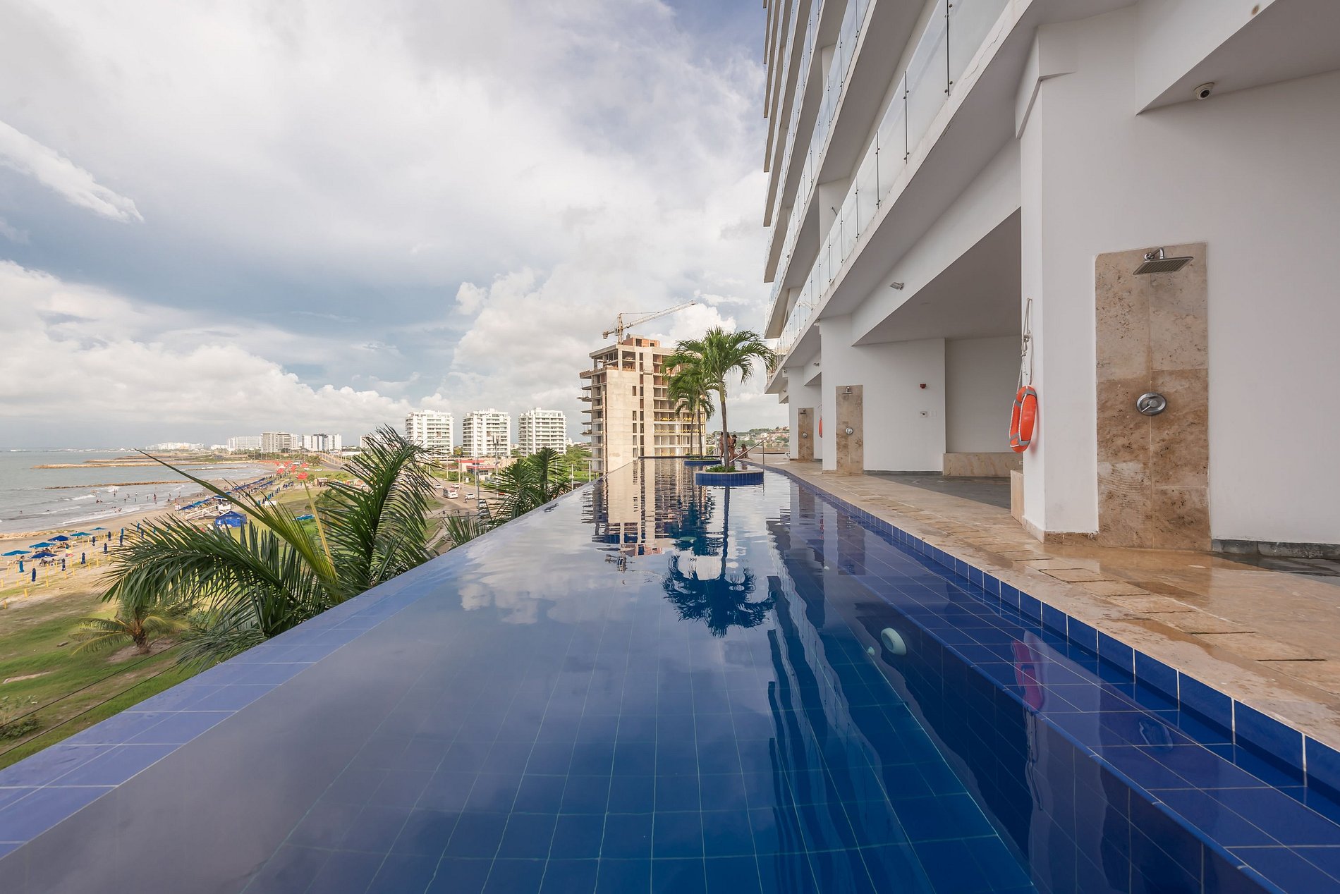El apartamento tiene una espectacular vista al mar desde la sala, el balcón, el cuarto y el baño principal y se encuentra en un edificio moderno con piscina de adultos y de niños, sauna, turco, jacuzzis, parque de juegos infantiles, zona de asoleadoras, gimnasio y seguridad las 24 hs