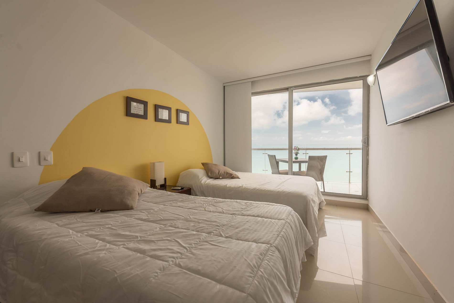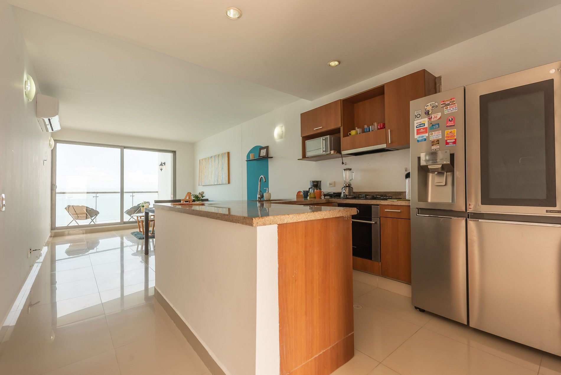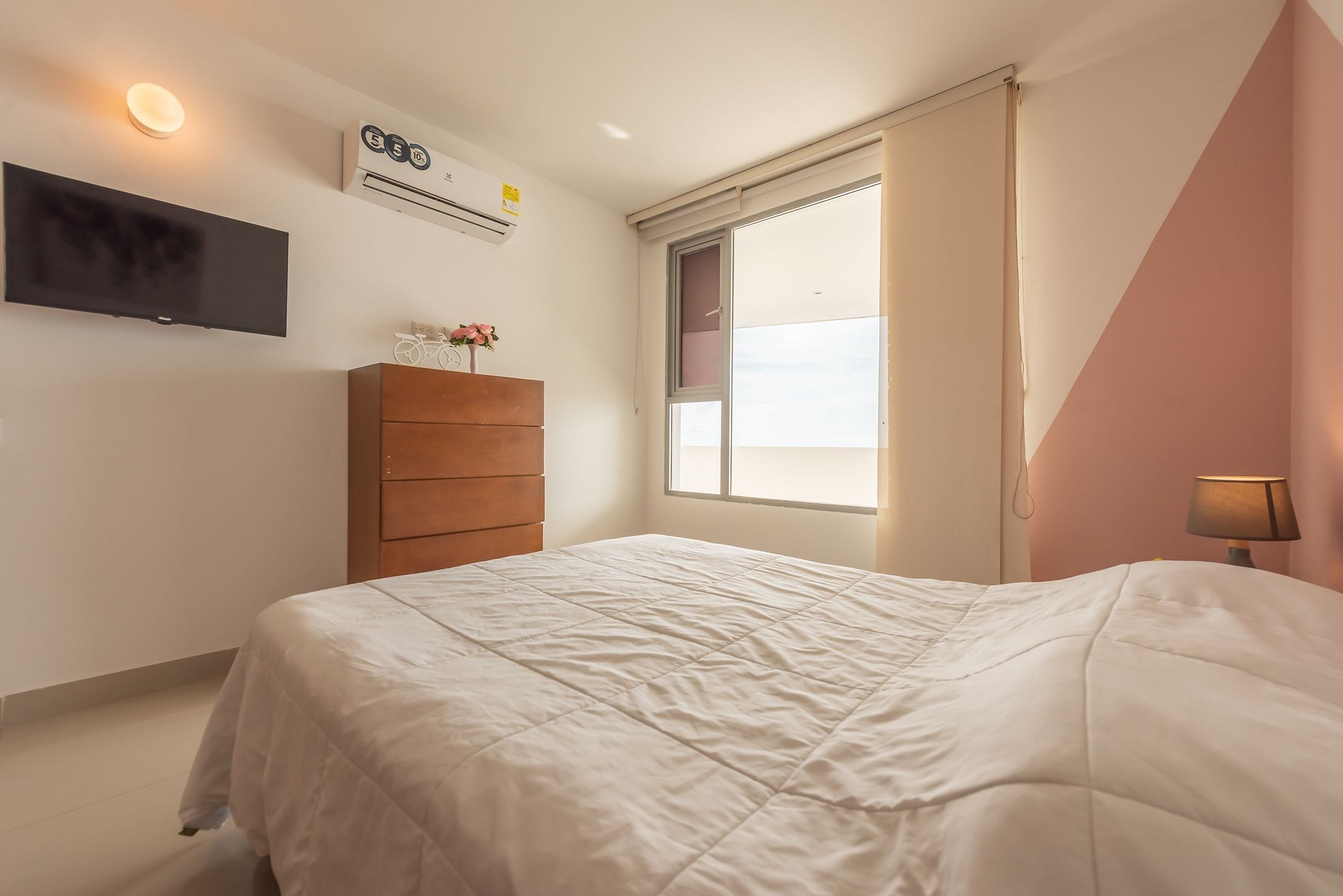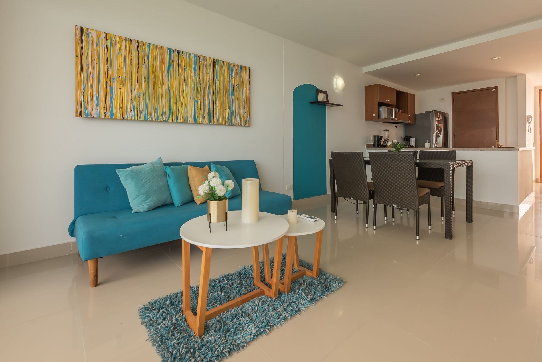 Amplio apartamento de 2 cuartos, 2 baños, sala-comedor, cocina, área de labores y balcón, ubicado frente a las playas de Marbella, a 5 min en taxi desde el aeropuerto y desde la ciudad amurallada (8 cuadras).
