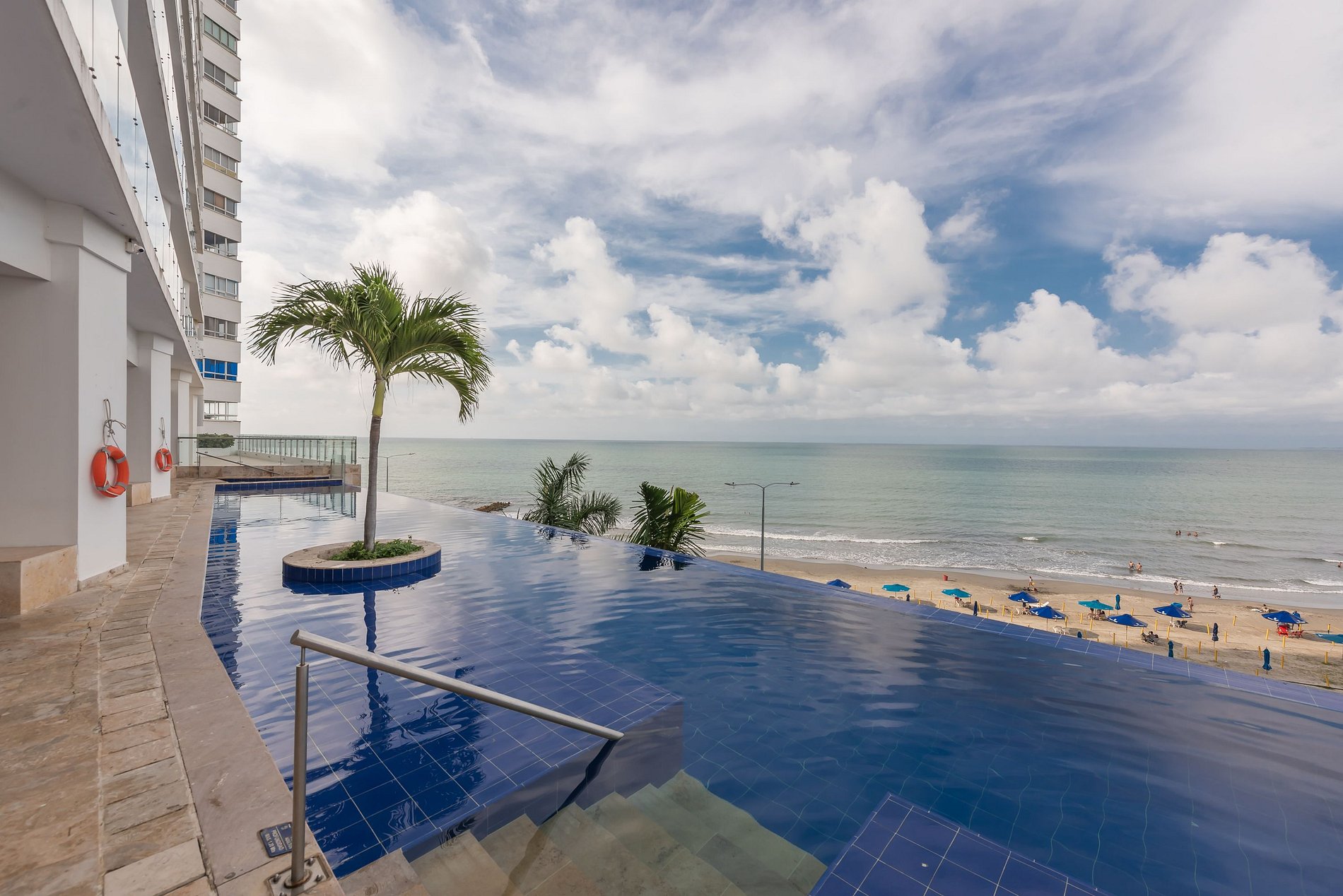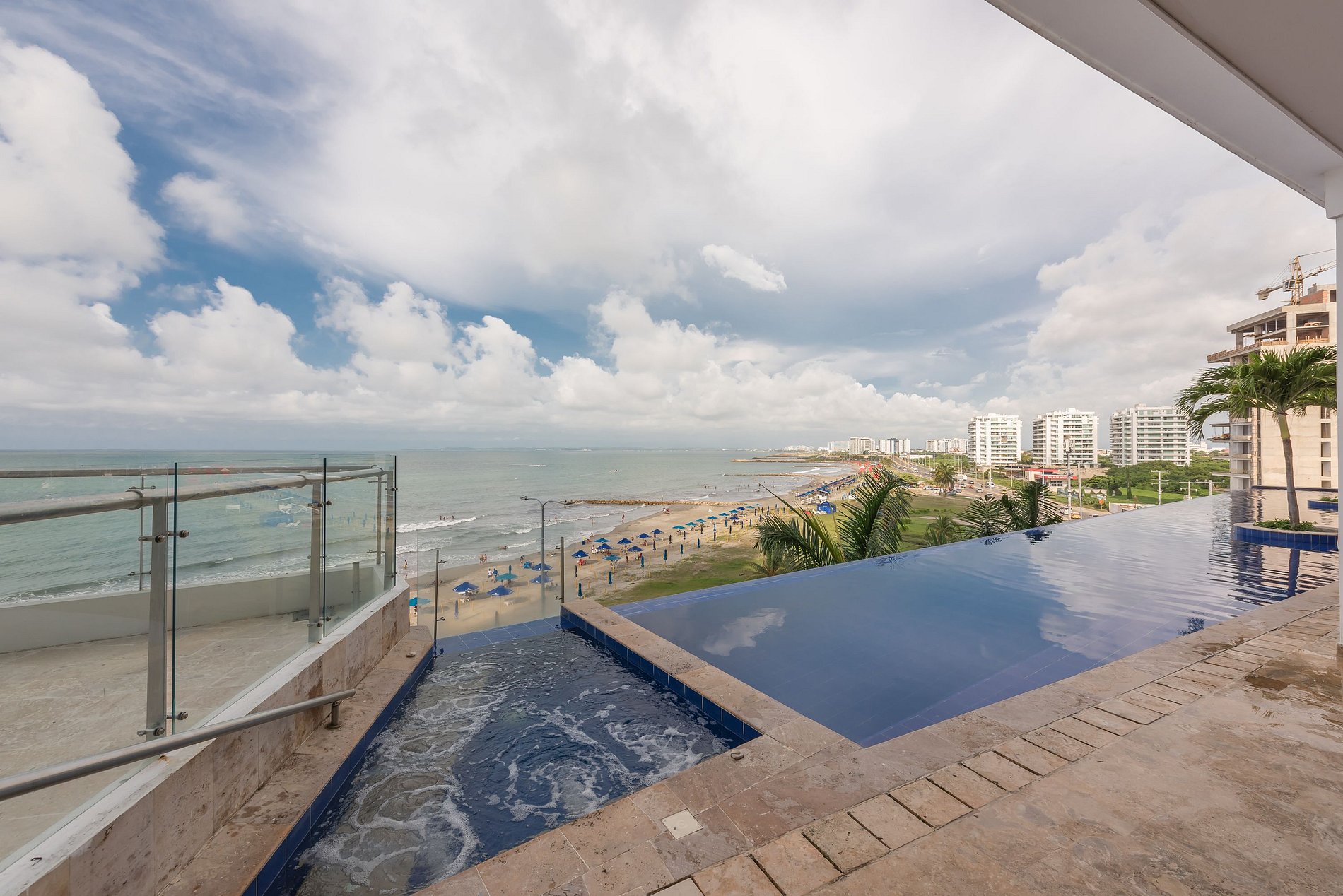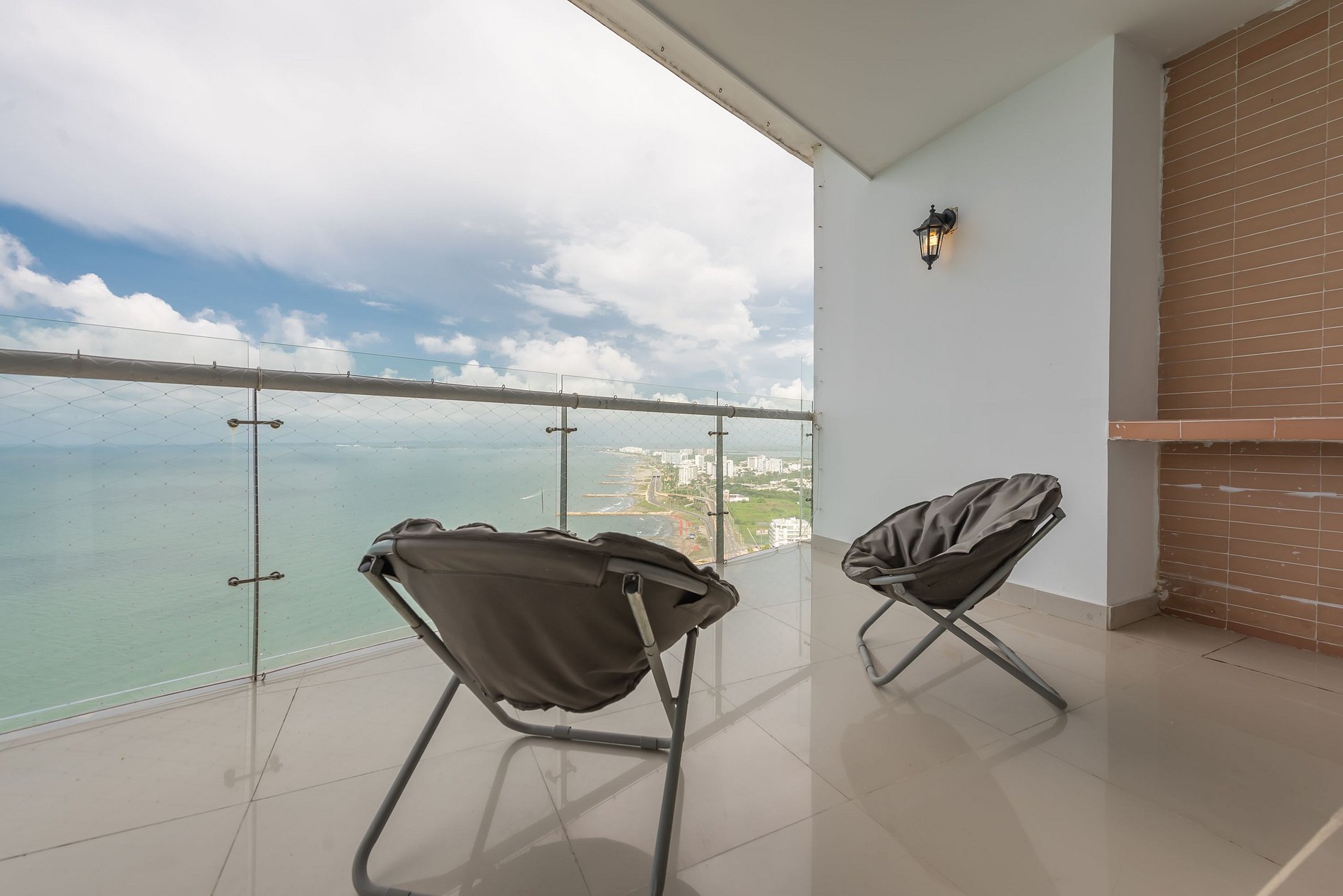 El apartamento tiene una espectacular vista al mar desde la sala, el balcón, el cuarto y el baño principal y se encuentra en un edificio moderno con piscina de adultos y de niños, sauna, turco, jacuzzis, parque de juegos infantiles, zona de asoleadoras, gimnasio y seguridad las 24 hs