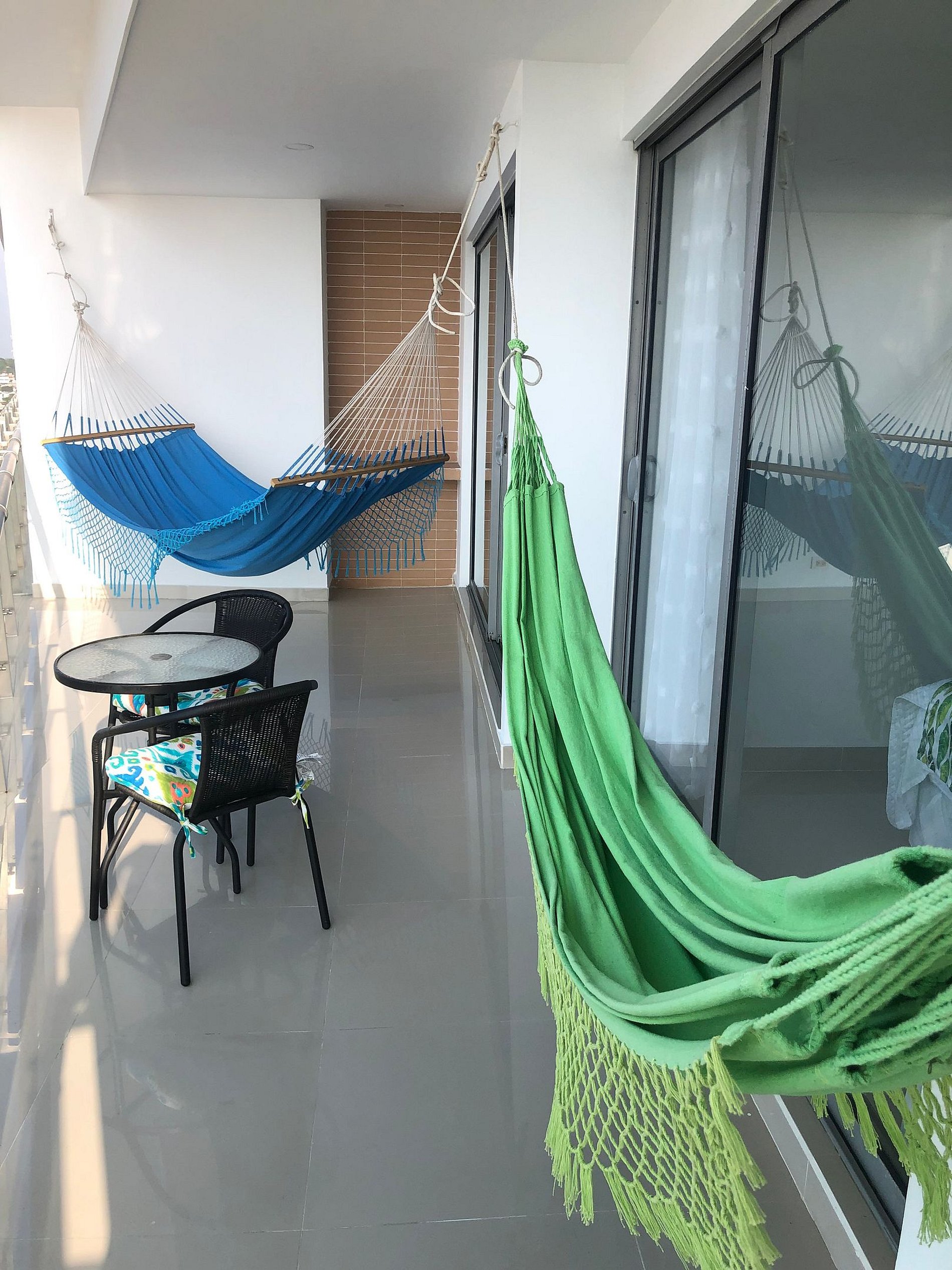 El balcón tiene una hermosa vista a la playa, con un comedor de 2 puestos y 2 hamacas.
